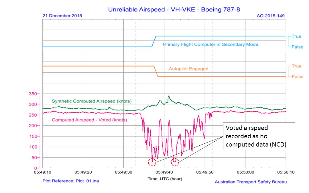 It was noted that the 787 aircraft pitot-static air-data reference system (ADRS) passes the values from the three independent pitot-static sensor systems through a fault detection system which integrates them into a single 'voted airspeed' which is then shown on the PFDs. Separately from this process, an alternative derivation of airspeed is computed from the Angle of Attack (AOA) (AoA) and inertial reference systems and described as the 'AoA speed'. Any "significant disparities" between the voted airspeed normally displayed on the PFDs and the AoA speed will result in the annunciation of the 'AIRSPEED UNRELIABLE' message accompanied by disconnection of the AP. If the gap between the voted airspeed and the AoA speed then becomes sufficient to breach a predetermine threshold - in this case the voted airspeed reached the 'No Computed Data' level - then the Primary Flight Control System reverts to Secondary Mode. In this mode, various system functions, including the autopilot, are no longer available and it was found that "for the conditions of this event", Secondary Mode was a latched condition which, once activated, meant that Normal Mode could only be re-instated on the ground.