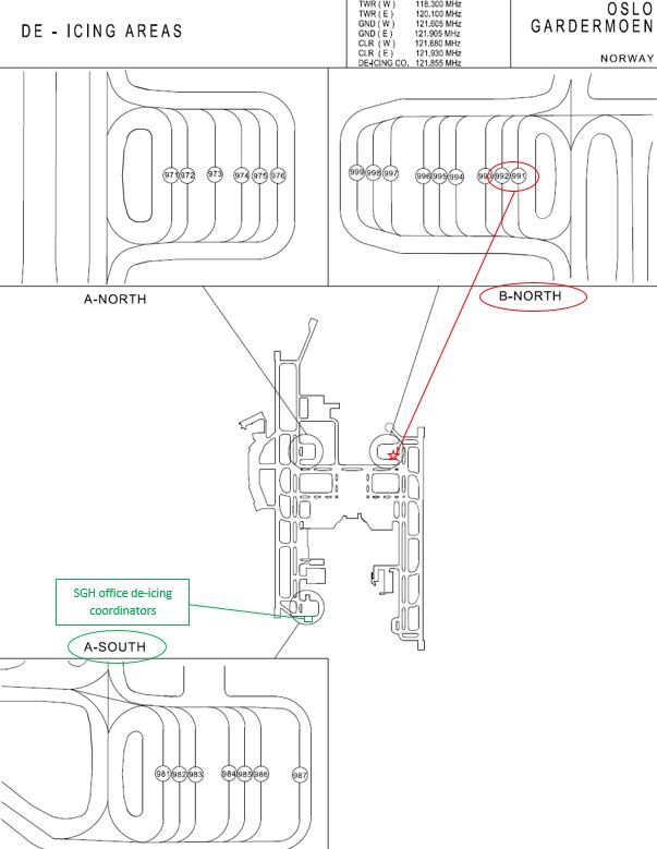 - The absence from Norway AIP or any NOTAM information about what de-icing stand could be used by the various aircraft categories.