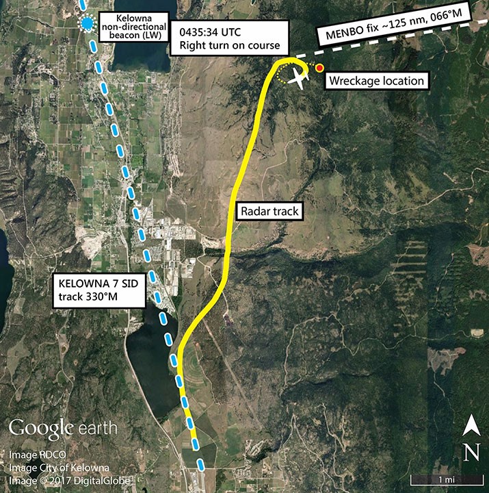 Once the three passengers had arrived and boarded, the aircraft had taxied for runway 34 and was cleared to enter and take off from its intersection with taxiway ‘D’ on a SID which required a straight ahead climb to 4,000 feet QNH with an automatic transfer to Vancouver Centre and a slight track adjustment direct to the Kelowna NDB at that point until radar vectors to the assigned route were given. Kelowna airport is located on a valley floor at an altitude of 1,421 feet and is surrounded by high terrain at elevations exceeding 7,000 feet.