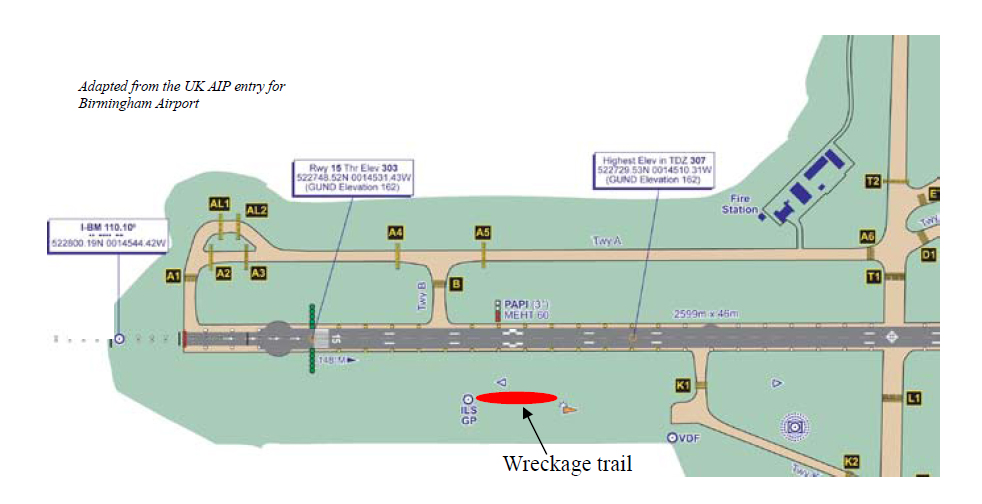 On 19 November 2010, a Cessna 501 being operated by The Frandley Aviation Partnership on a domestic cargo flight from Belfast Aldergrove to Birmingham continued descent on an initially visual day ILS approach to Runway 15 into IMC and until collision with the ILS GS aerial adjacent to the intended landing runway occurred. The aircraft caught fire and was destroyed. Both pilots were injured, one seriously.