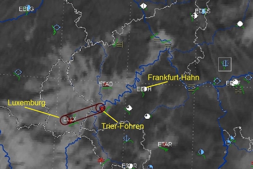 It was noted that the fog in the general area was widespread but not continuous - see the satellite image below - and that although a landing would not have been possible at Luxembourg, the weather at Frankfurt Hahn had been good and in line with the earlier forecast. The weather recorded at Trier-Fohren at the time of the accident included a visibility of 100-150 metres in freezing fog with a surface wind from 040° at 3-5 knots.