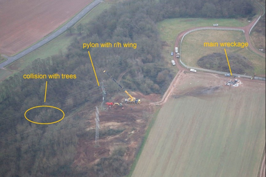 The accident site annotated with the location of the electricity pylon and the main wreckage [Reproduced from the Official Report]