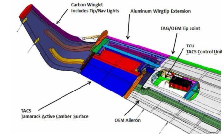 It was noted that the ‘ATLAS’ system which was the focus of the Investigation operated independently of all other aircraft systems. The modification requires that the original wing tips are removed and 22 inch extensions, incorporating the winglets, are attached in their place (see the illustration below). Active aerodynamic control surfaces referred to as ‘Tamarack Active Camber Surfaces,’ (TACS) are positioned in the horizontal section of these extensions. The ‘TACS’ are automatically activated in the event of high positive or negative g to unload the wing and keep the wing loading within the original envelope.