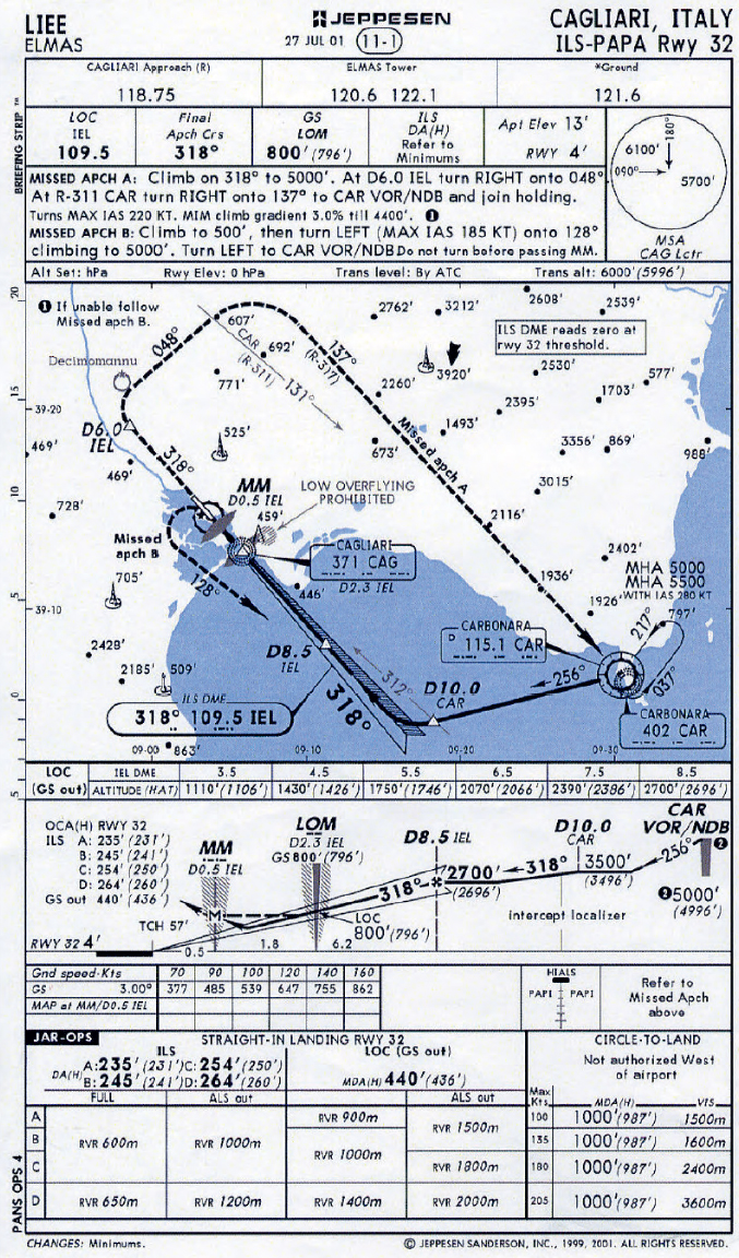 On transfer to Cagliari APP descending in accordance with clearance to FL090, the crew were informed that runway 32 was in use and the weather was passed. APP then advised that an ILS PAPA approach should be expected. It can be seen from the copy of the Jeppesen Chart below (as used by the crew) that this requires routing via the CAR VHF Omnidirectional Radio Range (VOR) before flying an intercept to the ILS LOC. This avoids mountainous terrain to the east of there aerodrome which results in an MSA of 5700 feet.