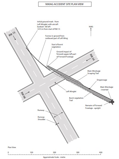 The takeoff from runway 15 appeared to have been normal until lift off. Rotation was commenced at 146 KCAS at an initial pitch rate of around 4°/second with lift off occurring 2 seconds later at about 153 KCAS. Once airborne, the elevator position was reduced from 8° to 3° as the pitch rate increased to about 5°/second and the aircraft immediately began to bank left at a rapidly increasing rate, reaching 50° within 2 seconds as the heading diverged 10° to the left of the runway centreline. FDR data showed that opposite aileron and right rudder inputs had been made immediately after the left bank began and both were fully applied within 1 second and maintained. When the bank angle reached 80°, the left wing tip made surface contact at a point 1,415 metres from the beginning of the runway from where the takeoff had been commenced. As the bank angle continued to increase, nose-up elevator input was progressively increased and 3½ seconds after takeoff, stick shaker activation was recorded. Recorded data ceased at impact 2 seconds later with the last recorded aircraft attitude being 111° left wing down and 13° nose down on a heading of 114°M. The aircraft was observed to impact the ground inverted and as the forward fuselage separated from rest of the aircraft, a major fuel fed fire started which in conjunction with impact forces led quickly to the almost complete destruction of the aircraft. The annotated illustration below shows a plan view of the aircraft ground track from the point where ground contact first occurred.
