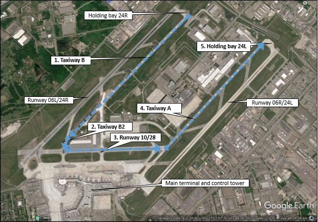 The GND controller monitored the progress of the convoy at intervals. After five minutes, the convoy had reached position 3 on the illustration provided above and the Convoy Lead reported having begun to “plan the convoy formation and path along Runway 24L based on the snowfall intensity and the wind direction”. At this time, the CRJ200 had just been cleared to land on runway 24L. As the convoy reached its clearance limit, the 24L Holding Bay, the CRJ200 was approximately 1.3 nm from touchdown.