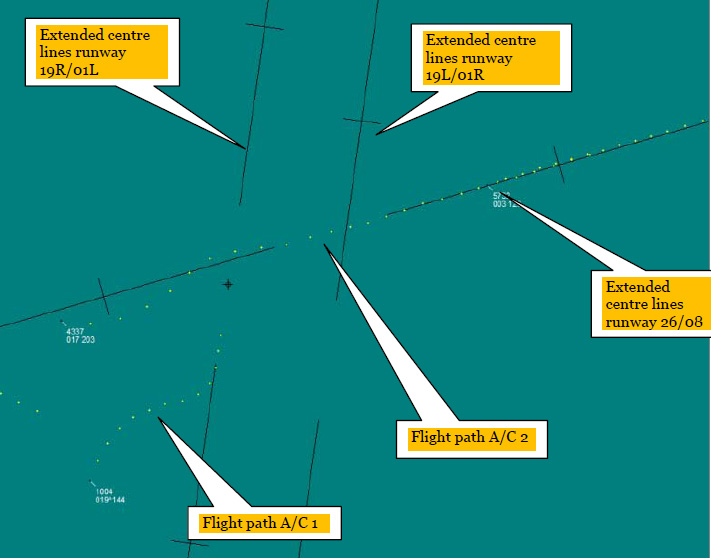 The relative tracks of the two aircraft (reproduced from the Official Report - the gaps in between the runway extended centrelines are the runways; north is at the top)
