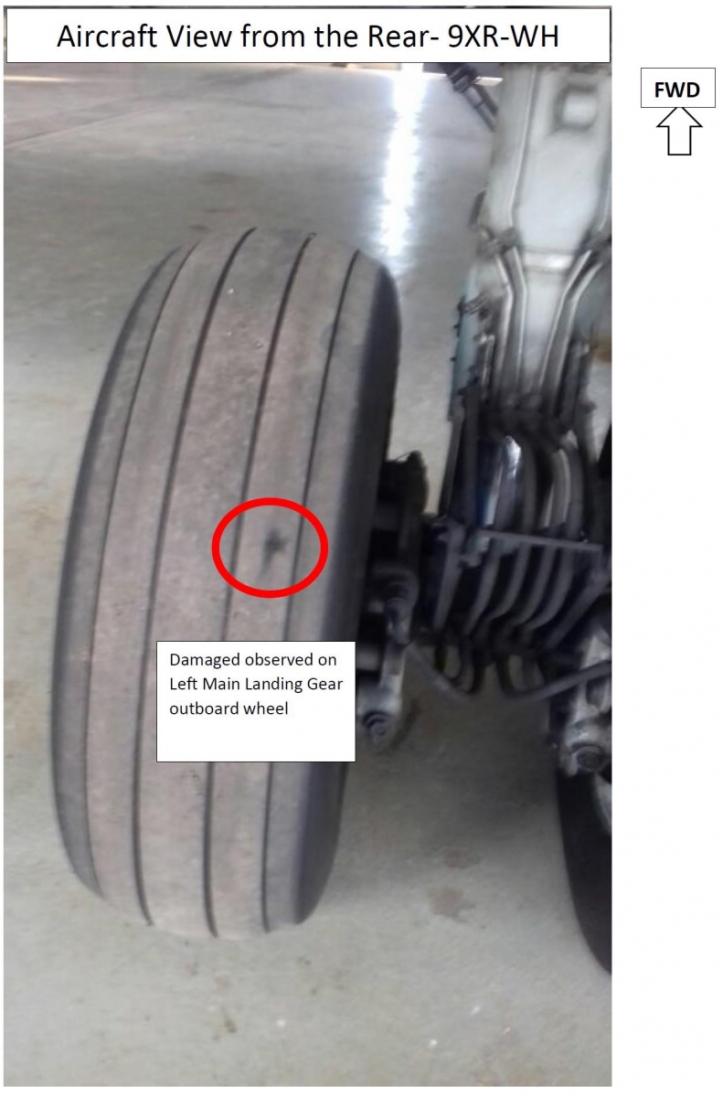 Damage to the outboard left-hand main landing gear tyre. [Reproduced from the Official Report]