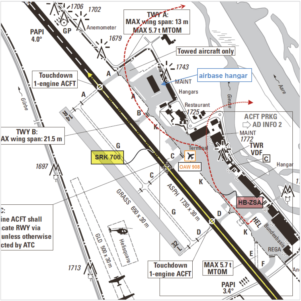 It was noted that the AIPs entry for Bern did not include a documented departure route from the helipad to point HOTEL or the other two helicopter designated helicopter reporting points and that "the departure route 'around the tower' used when there were north-westerly winds, was not prescribed or published" despite its use being "common practice" for locally based pilots. It was concluded that "the absence of mandatory departure routes from the helipads to departure points….. contributed to the dangerous convergence of the two aircraft and therefore to the occurrence of the serious incident."