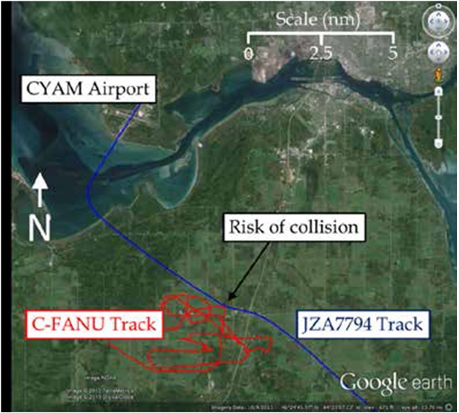 The tracks of the conflicting aircraft (CYAM was the DH8 departure point, C-FANU was the light aircraft involved) (Reproduced from the Official Report)