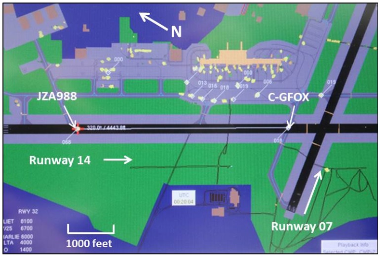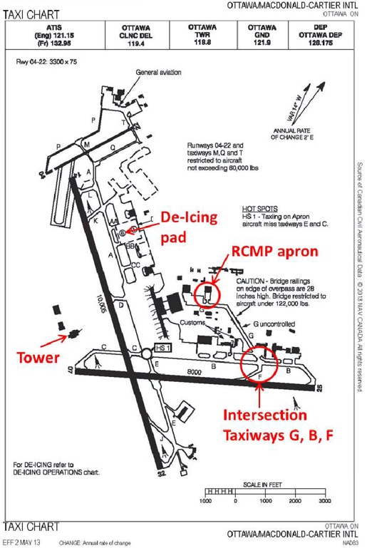 - The Ground controller issued instructions to C-GFOX to taxi unrestricted from the Royal Canadian Mounted Police Apron to Runway 07, despite the frequent use of Runway 14 for departing aircraft.