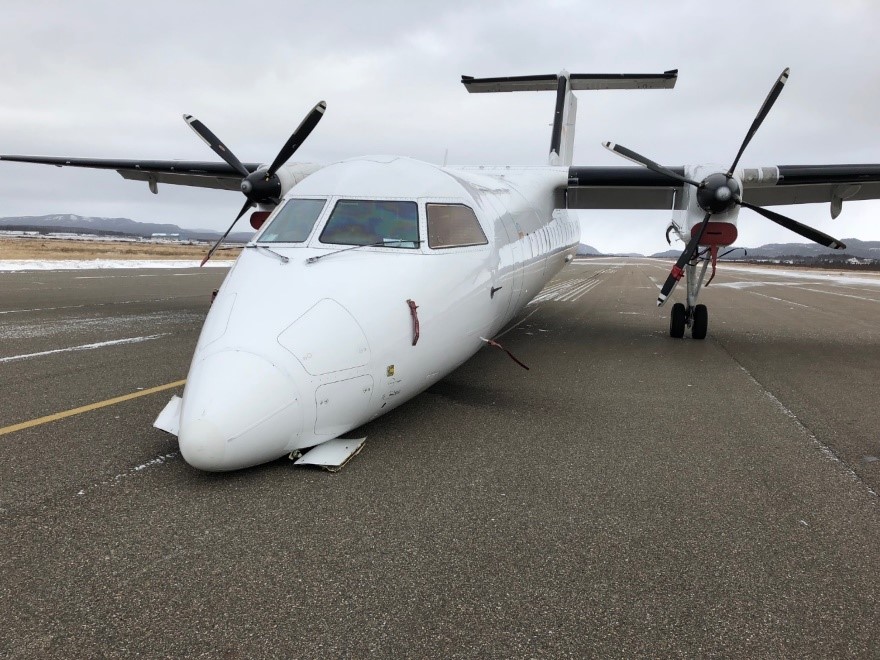 On 15 November 2018, a Bombardier DHC8-300 made a main gear only touchdown at Stephenville with only minor damage after diverting there when the nose landing gear only partially extended when routinely selected on approach at the originally intended destination. The Investigation found that the cause was incorrect nose gear assembly which had allowed hydraulic fluid to leak and eventually led to it jamming. There was some concern at the way the flight was conducted following the problem which involved continuous smartphone communications with the operator and an overspeed which it was considered constituted an avoidable risk to safety.