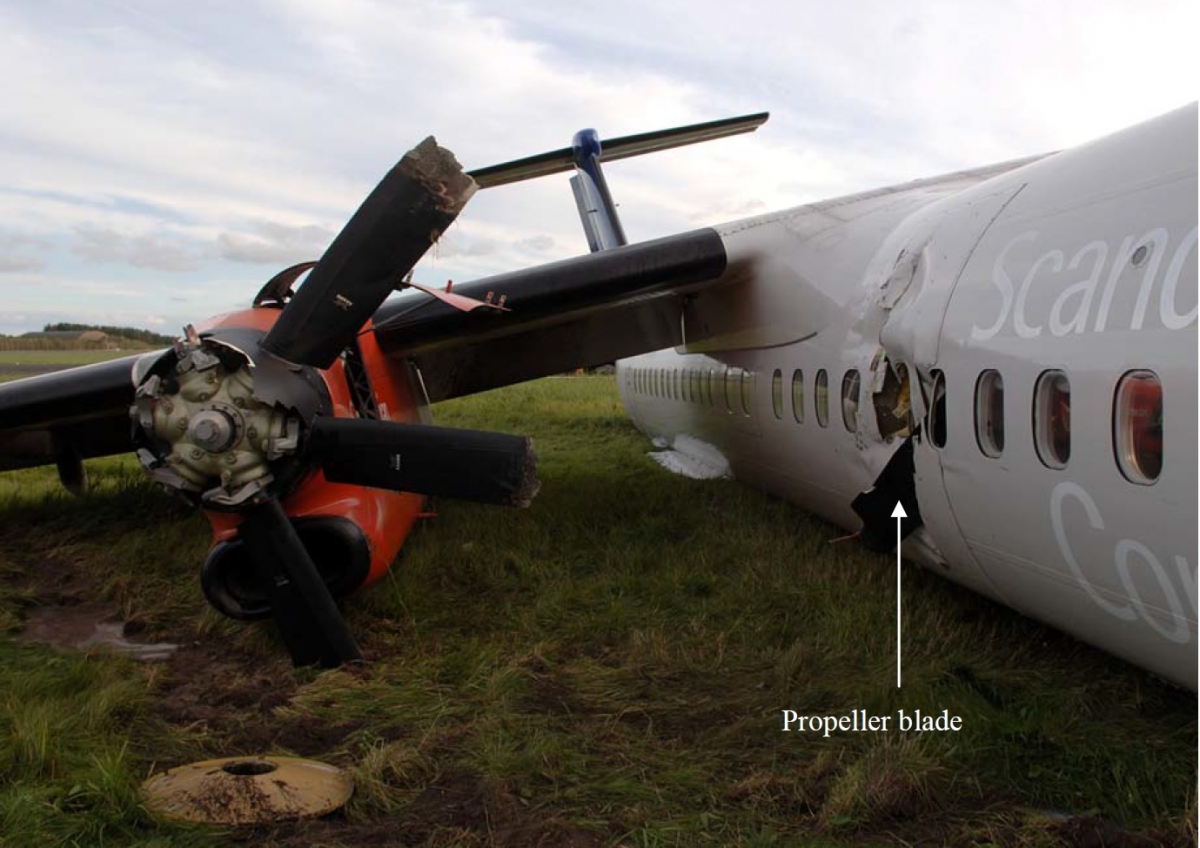 All six right hand propeller blades struck the runway; three were found completely separated from the hub, the remains of the other three were found attached to the hub and as scattered debris. Two blades penetrated the passenger cabin structure, one completely via the window adjacent to seat 8F which then hit the opposite cabin wall above seat 8A and the other partially at seat 7F before becoming embedded in the adjacent fuselage structure. A passenger seated in 8C was hit by the first blade. It was concluded that the reseating of the passengers from the right hand side in rows 6, 7 and 8 on the initiative of the crew had reduced the number of passenger injuries.