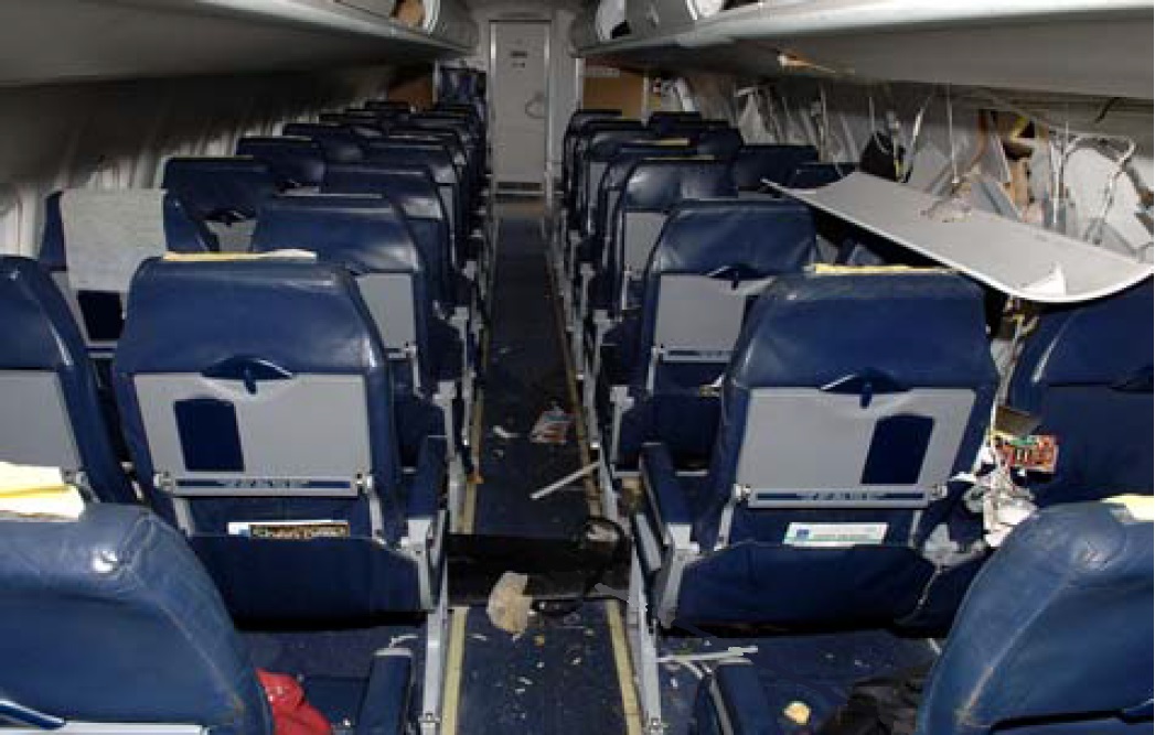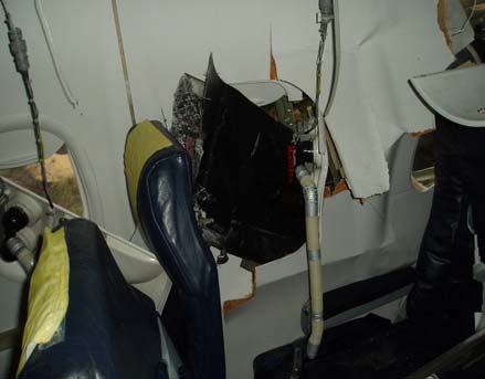 The passenger cabin showing the same propeller blade across the aisle from above the seal from the window it entered through can be seen around it. (Reproduced from the Official Report)