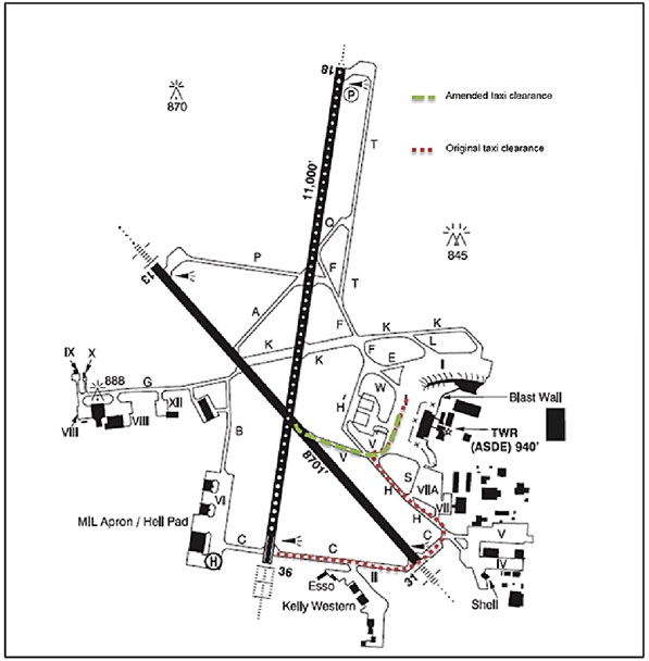 The airport layout showing the initial and revised taxi clearances to the corresponding departure runway holding point (reproduced from the Official Report)