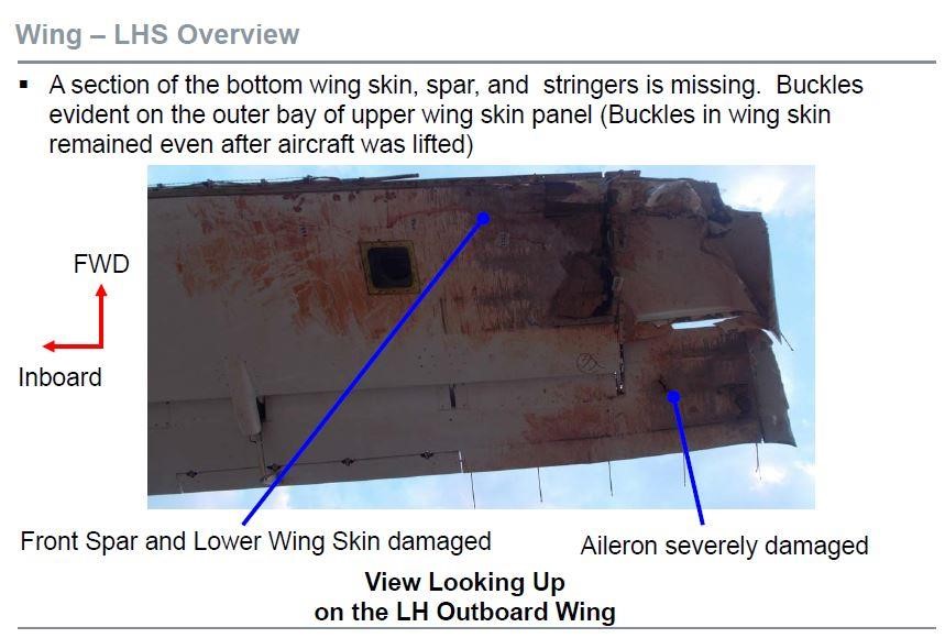 Damage sustained by the aircraft was extensive and included, but was not limited to, extensive structural damage to the fuselage and left wing, both engines and the nose and left main landing gear - see the illustrations below in the case of fuselage and wing damage.