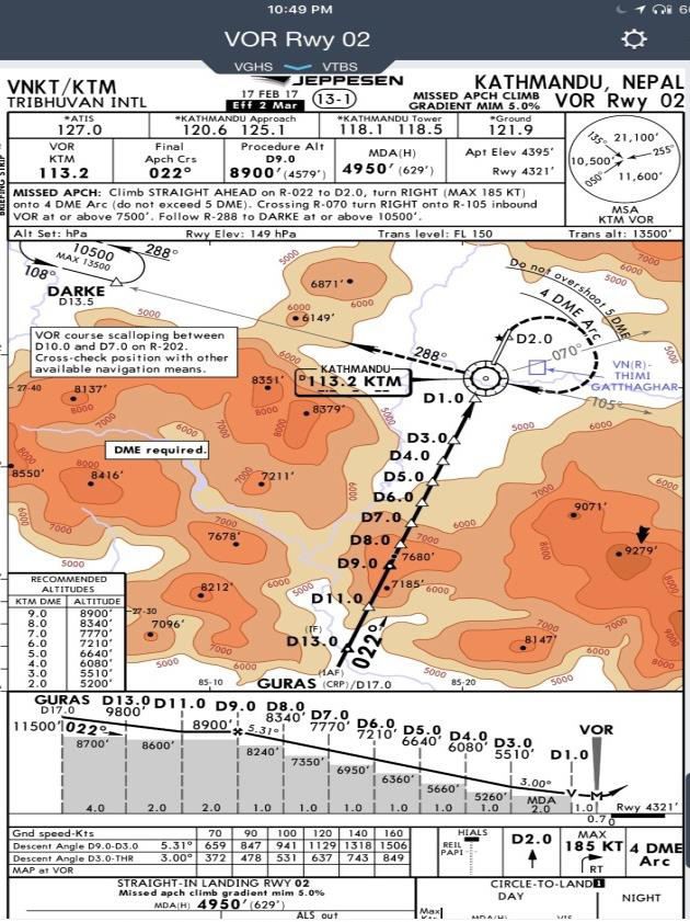 Initial descent to FL160 was given together with an Expected Approach Time (EAT) which might involve taking up a brief hold before commencing the approach. On transfer to the APP frequency, further descent clearance to 13,500 feet was given (the aerodrome reference point (ARP) elevation for Kathmandu is 4395 feet) with a clearance limit of waypoint GURAS, the IAF for the 02 approach, to take up the hold there. The IAF was just under 18 nm from the runway threshold and the procedure required the descent from that point to commence at 11,500 feet. The FMS ‘HOLD’ mode was armed accordingly and further descent to 12,500 feet was given at minimum clean speed. A hold of up to 6 minutes appeared likely but then APP gave further descent to 11,500 feet, cancelled the EAT and cleared the flight to commence the approach without any delay with GURAS only 3 minutes flight time away. The AP was engaged and IMC prevailed.