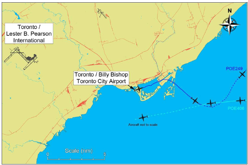 On transfer to radar, the outbound aircraft made a call on the radar frequency advising that it was leveling at 2000 feet and in the turn to heading 141° but this was not heard by the controller who was “busy communicating with a different controller regarding an unrelated control issue”. Shortly afterwards, the radar controller contacted the airport controller to seek information on the departing aircraft. Sixteen seconds later, communication was established with this aircraft and it restated its position. Without acknowledging that transmission, the radar controller immediately instructed the inbound aircraft to level off at 2500 feet upon which this aircraft replied that it had already descended through 2300 feet but would climb back to 2500 feet. The radar controller then informed the departing aircraft of the position of the inbound one 1.5 nm away at 2300 feet and six seconds later, the departing aircraft reported the inbound one in sight. Then, whilst another aircraft transmitted on the radar frequency, both aircraft received and responded to TCAS RAs and “seconds later” crossed flight paths with 300 feet vertical separation approximately 6 nm east southeast of Toronto City Airport. The diagram below shows the tracks of the two aircraft.