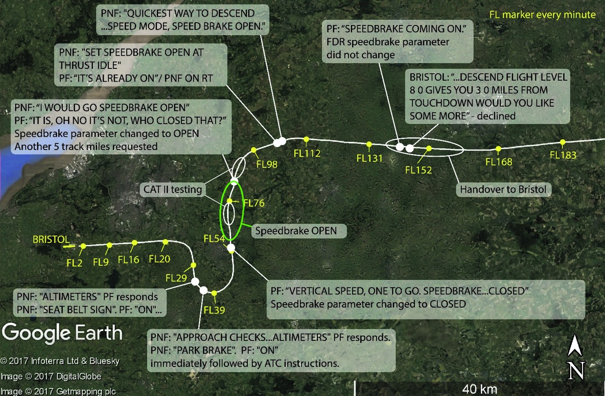 A Field Investigation was carried out by the UK AAIB. Data were successfully downloaded from both the FDR and CVR. FDR data parameters did not include use of the Emergency/Parking Brake but did include use of the speed brakes. Other available recorded data sources were ATC communications, the airport primary radar, the regional secondary radar which covered the Bristol area and airport CCTV recordings. FDR data were matched to ATC radar data to establish the aircraft flight path as it positioned for the approach.
