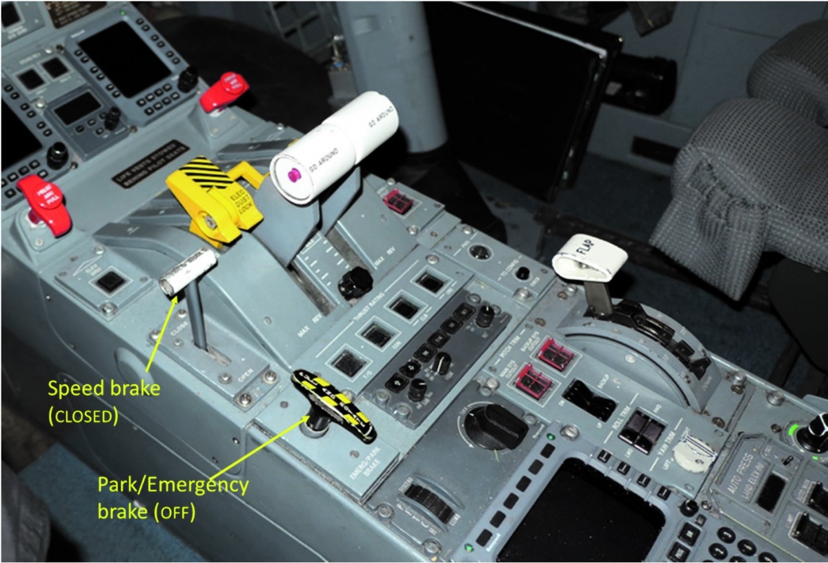 The two handles are located in close proximity on the left hand side of the central console. However, the Speed Brake control moves fore and aft in the same plane as the thrust levers with the forward position being closed and operates the outer spoilers. The Parking Brake - which also doubles as an Emergency Brake - is applied by pulling the yellow and black striped handle up and then turning it 90° to the left to lock it in position. The illustration below shows the relative positions of the two brake selectors.