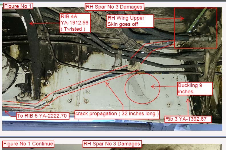 During the subsequent turnround, the First Officer was tasked with carrying out the pre-flight external check and he did not observe any indications of damage to the aircraft. A return to Yangon was followed by a flight from there to Tachileik and back. Inspections carried out by a licensed engineer during the Yangon turnround did not detect any damage nor did the Captain’s external inspection at Tachileik. Only when the day’s flying was complete and maintenance personnel at Yangon were carrying out a routine overnight inspection, were multiple cracks found to parts of the right wing of the aircraft. These included a broken right wing spar and a twisted rib (see the first illustration below), separation of the wing skin at its trailing edge and buckling of the wing inboard spoiler. This inspection also found that the fuselage-to-wing lateral fairings on both the left and right hand wings were deformed by buckling (see the second illustration below). The flight crew did not report a suspected hard landing to anybody.