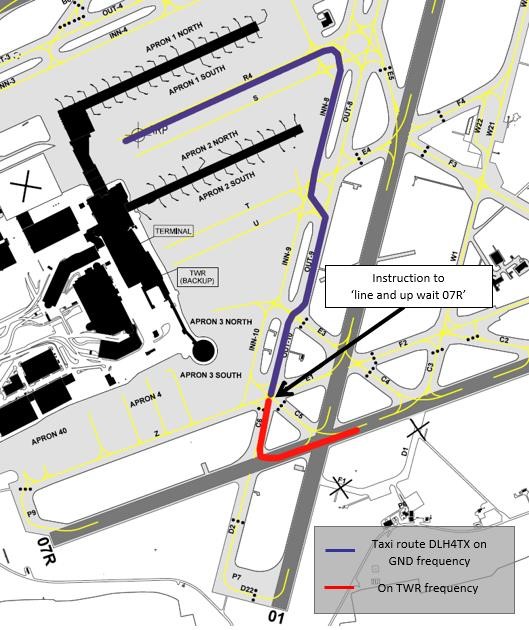 The taxi route followed by the E195 showing where the change to TWR occurred. [Reproduced from the Official Report]