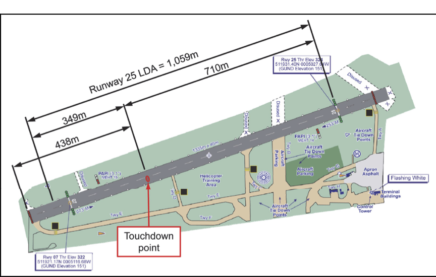 The aerodrome chart, showing the LDA in relation to the approximate touchdown point and the aircraft final stopping position. The black bar at the end of the paved surface shows the position of the embankment which the aircraft hit. [reproduced from the Official Report]