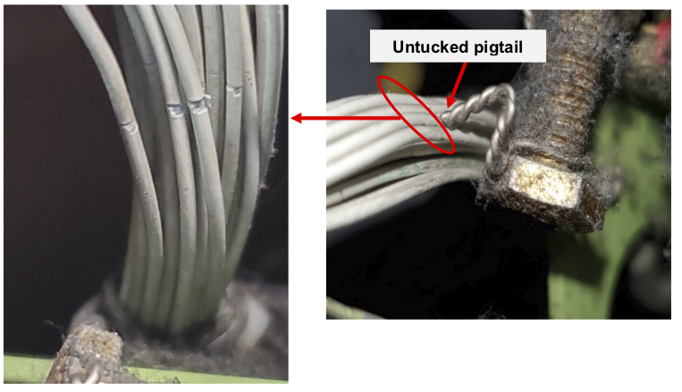 The wire damage (left) and the mis-positioned “pigtail” which had caused the damage (right). [Reproduced from the Official Report]