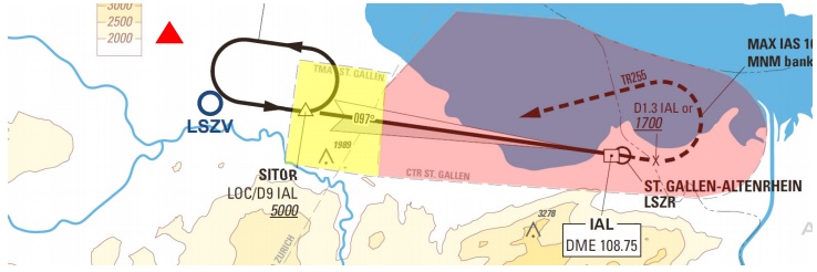 An extract from the St. Gallen-Altenrhein ILS 10 Chart showing the CTR (red) and TMA (yellow) with the location of the conflict shown as a red triangle. [Reproduced from the Official Report]