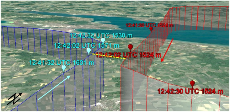 Since the glider’s transponder was switched off, it was not visible on ATC radar monitors or on the Falcon 2000’s TCAS. The flight paths of both aircraft are shown in the illustration below. The minimum separation was estimated from available recorded data as 660 ± 100 metres laterally and 40 ± 25 metres vertically.