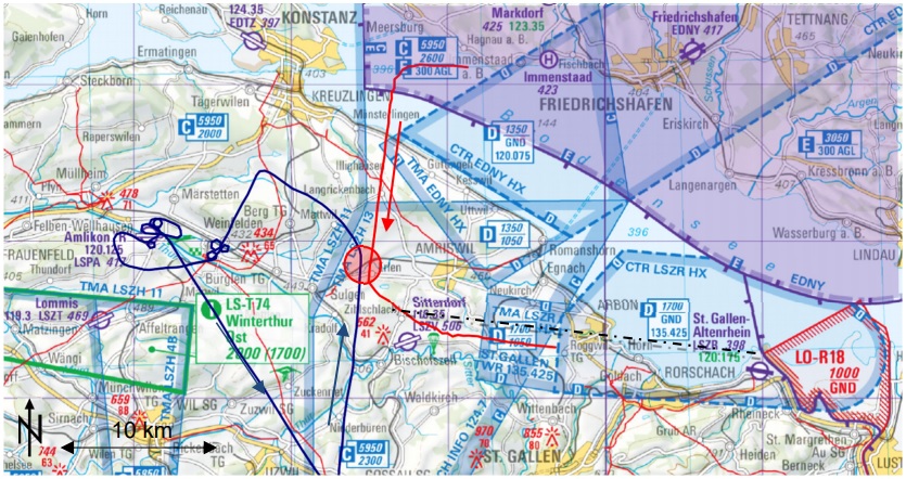 The Aero Club of Switzerland should raise awareness amongst its members of the fact that increased IFR traffic is to be expected in Class E airspace which borders on Control Zones (CTR) and Terminal Control Areas (TMA) of regional airports such as St. Gallen-Altenrhein. Keeping the transponder switched on continuously and making contact with the aerodrome controller of the respective aerodrome to communicate their own position and flight altitude are the only possible ways, besides ‘see and avoid’, to make a VFR aircraft detectable by IFR traffic.