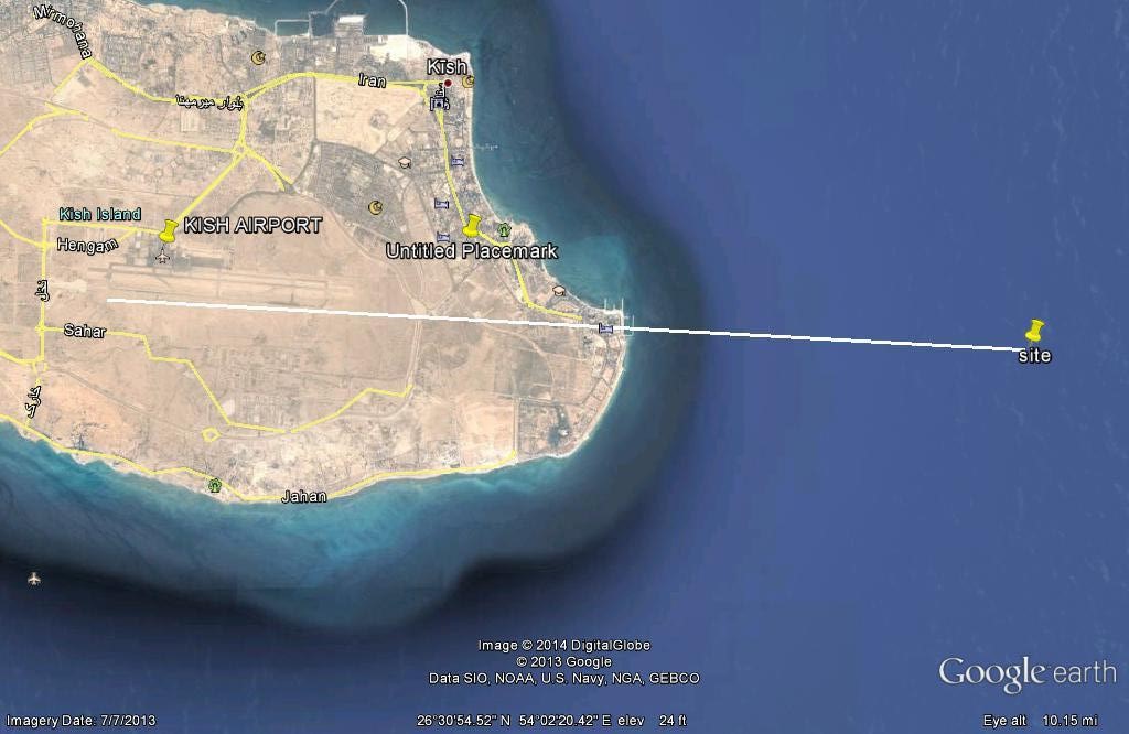 The location of the crash site in relation to Kish Island Airport. [Reproduced from the Official Report]