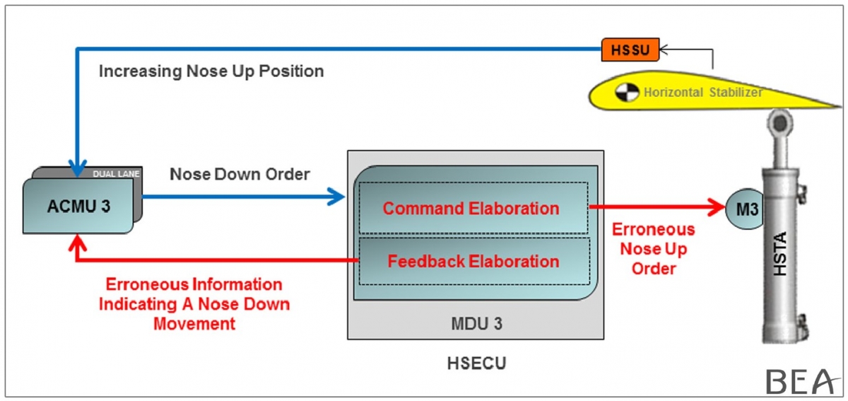 With these findings, it was determined (see the diagram below) that the transient malfunction in the HSECU internal power supply had resulted in the Unit's Control Channel sending a constant nose-up command to the THS motor whilst simultaneously sending a rotation speed signal to the Actuator Control and Monitoring Unit (ACMU) which indicated that there had been a nose-down movement of the THS.