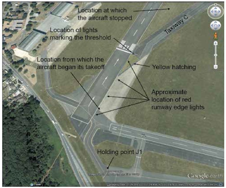 - Biggin Hill Airport installed reflective studs to delineate the taxiways and runway access points around the Runway 03 threshold as a temporary measure ahead of more permanent improvements to taxiway lighting. This action was intended to reduce the risk that crews following the taxiway around the first right turn after J1 would proceed straight ahead, as the aircraft in this accident did.