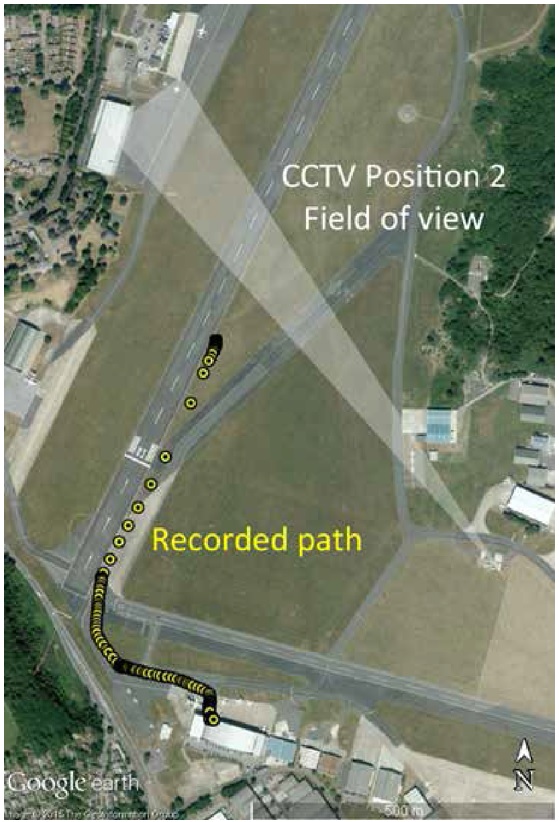 The recorded ground track of the aircraft. The field of view around the time of the accident of a CCTV installation from which recordings were examined to assess visibility is also shown. (Reproduced from the Official Report)
