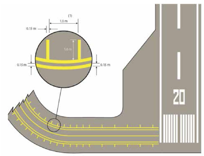 UK requirements for taxiway edge marking, (UK CAP 168 Chapter 7) where a contiguous paved surface not available for use was present, were found to require a specified marking (see the diagram below) which was not present at either of the locations where it should have been - the eastern side of the ORP at the beginning of Runway 03 where part of it is used as taxiway 'C', and the boundary between the southern end of the same ORP and taxiway 'J'.
