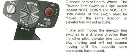 The G550 Pitch Trim System is conventionally configured and employs two mechanically actuated elevator trim tabs which can be manually or electrically controlled. Manual trim control is achieved by rotation of the elevator trim control wheels located on either side of the central pedestal and electrical trim control is achieved by use of the elevator trim switches on the outboard horn of each control column (see the illustration below) which control movement of the trim tabs through the elevator trim servo and bracket. These control column elevator trim switches are “dual/split-switches”, both halves of which must be moved in unison for a trim change signal to be generated. If they are held long enough for the pitch trim control limits (+21°or -7°), this will result in the annunciation of an Elevator Trim Up/down message.