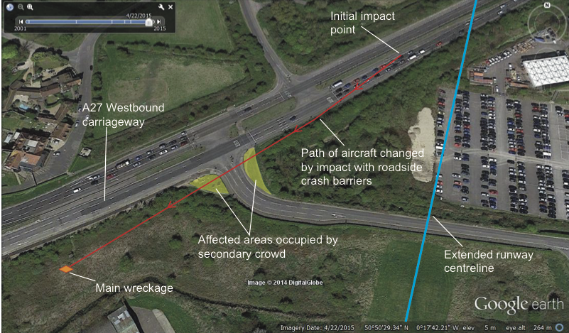 On impact, the aircraft collided with "a number of occupied vehicles, pedestrians, street furniture". During the impact sequence, "the external fuel tanks, which were made of phenolic resin reinforced with asbestos, fragmented and the right wing detached" which resulted in the release of "fuel and fuel vapour from the internal and external tanks" being released with explosive ignition following immediately. The aircraft broke into four large sections comprising "the forward fuselage and cockpit; the centre fuselage, engine and left wing; the rear fuselage and tail cone; and the right wing which was found inverted close to the centre fuselage". The accident site in relation to the extended runway centreline is shown on the first illustration below as are the two areas where people had informally congregated to watch the display (annotated as the "secondary crowd" areas). The approximate flight path of the aircraft is shown on the second illustration below. Overall, the available evidence "appeared to show that throughout the flight the pilot was conscious and that the aircraft was responding to his control inputs" and engine instruments visible on a camera fitted in the cockpit "did not indicate any engine malfunctions".