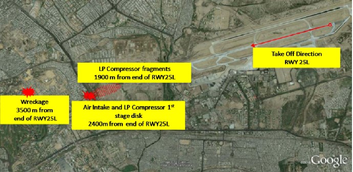 Location of debris from the uncontained No 4 engine relative to the crash site. [Reproduced from the Official Report]