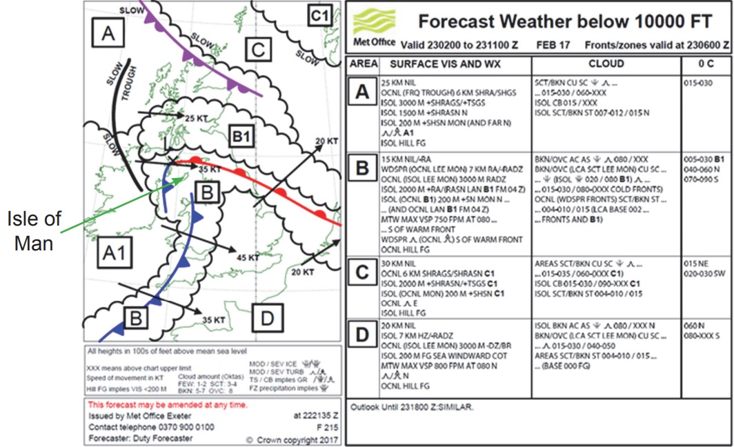 It was noted that on the morning concerned, “a deep low pressure system […] was centred in the vicinity of Northern Ireland and the Isle of Man”. The forecast chart aviation-relevant weather below 10,000 feet (see below) showed “a cold front approaching the Isle of Man and a slow moving trough following behind (with) the centre of the low pressure system expected to track across Northern Ireland, the Irish Sea and Northern England” during the forecast period. This chart “indicates that widespread moderate turbulence and occasional severe turbulence was forecast to the south of the warm front and therefore in the vicinity of the Isle of Man”.