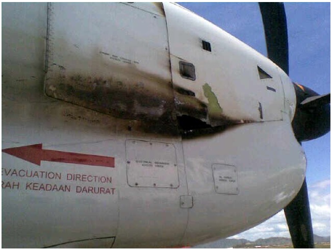 The left engine cowling after flight showing cowling damage (Reproduced from the Official Report)