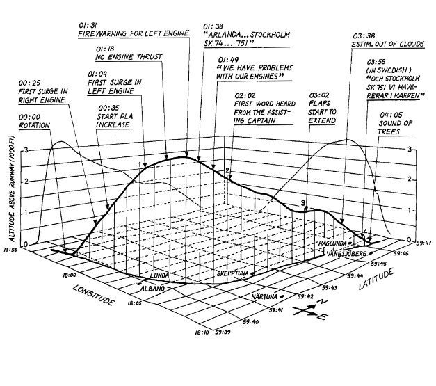 A uniformed SAS Captain seated near the front of the cabin realised that the crew were having problems and went forward to ask if he could be of any help. In response, "the First Officer gave him the Emergency / Malfunction Checklist and the Captain instructed him to start the APU". The assisting Captain's voice was subsequently recorded several times urging the Captain to "look straight ahead". The Captain maintained a shallow descent in cloud onto a northerly heading whilst the First Officer declared an emergency to ATC who in response to his request cleared the aircraft to turn back and land. The Captain announced several times "prepare for on ground emergency" and on being advised by the assisting Captain, the senior cabin crew made a corresponding announcement on the PA. With the aircraft still in cloud on a northerly heading and descending through 1,380 feet QNH, the assisting Captain began progressively extending the flaps, completing this in 30 seconds as the aircraft passed 980 feet QNH. About this time, the aircraft emerged from cloud and flight by visual reference to the terrain below became possible. The captain selected a field in the direction of travel for an emergency landing attempt, making a small heading change to avoid some houses. The First Officer asked if the gear should be selected down and, on being so instructed by the assisting Captain, did so. ATC were advised of imminent terrain impact and approximately 4 minutes after take-off, trees were struck and most of the right wing detached causing a bank to the right. The aircraft hit gently downward-sloping frozen ground tail first and the fuselage broke in two places but slid as one object for about 110 metres before stopping. There was no fire and all but four of the occupants were able to exit the wreckage unaided, about half of them via the openings caused by the break up of the fuselage. An annotated reconstruction of the flight path was made during the Investigation and is reproduced below.