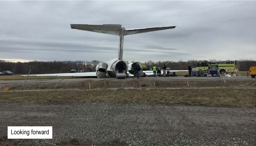 Damage to the aircraft was considerable and included all the landing gear assemblies being “bent, fractured and displaced aft” and lower fuselage damage consequent on gear collapse with lower skin panel assemblies showing severe buckling and deformation with some missing sections and damaged internal structure evident in places.