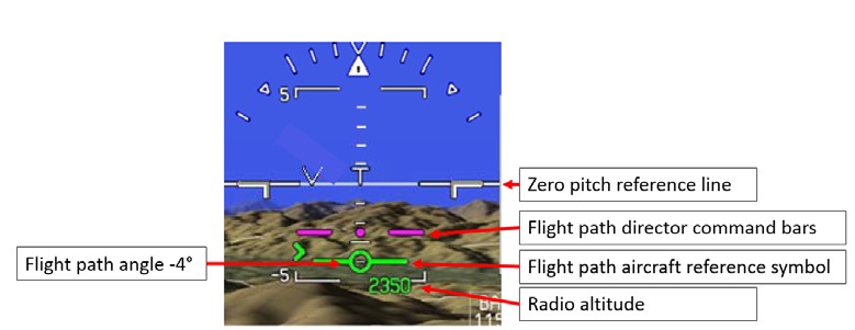 The SVS terrain depiction showing the ZPRL, the actual flight path reference symbol and the FD command bars. [Reproduced from the Official Report]