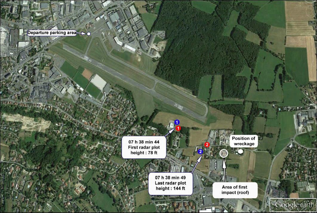 An aerial view of Annemasse showing radar returns from the aircraft and the site of the crash (reproduced from the Official Report)