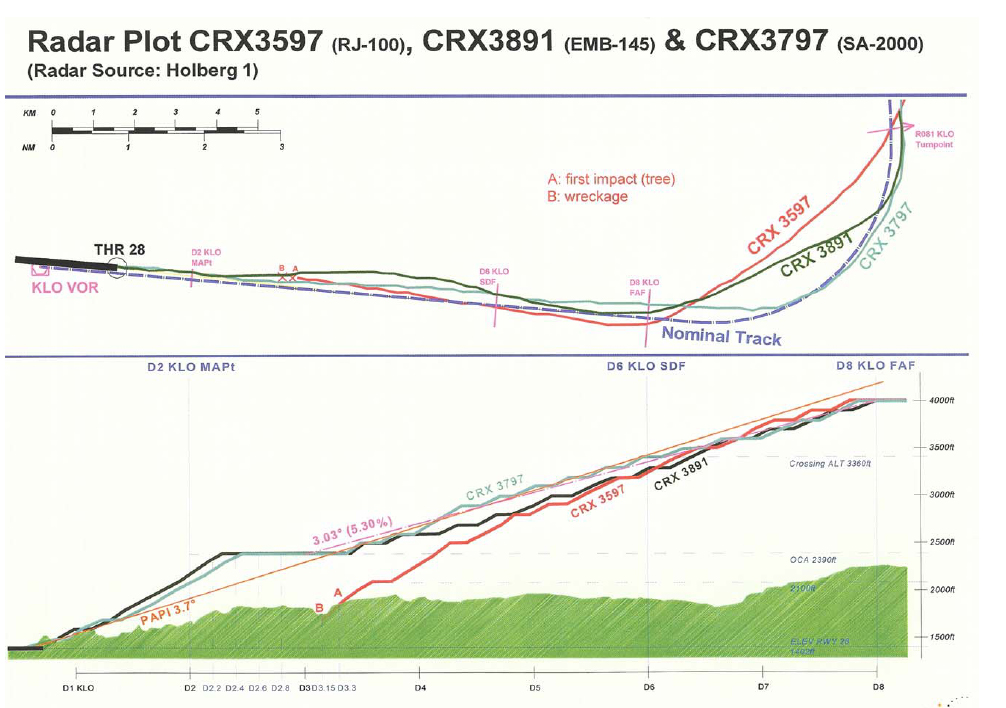 Track and Descent of the Accident aircraft (CRX 3597) compared to the two preceding flights and reference data (Reproduced from the Official Report)