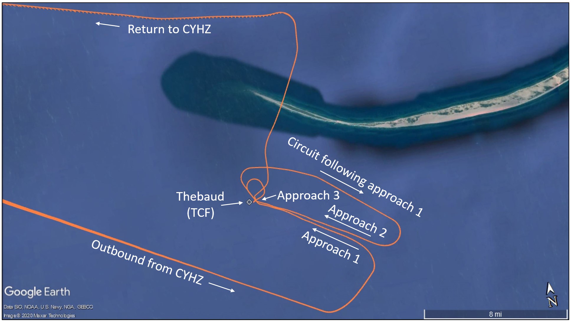 The ground track followed during all three approaches and (the land shown north of the platform is Sable Island). [Reproduced from the Official Report]