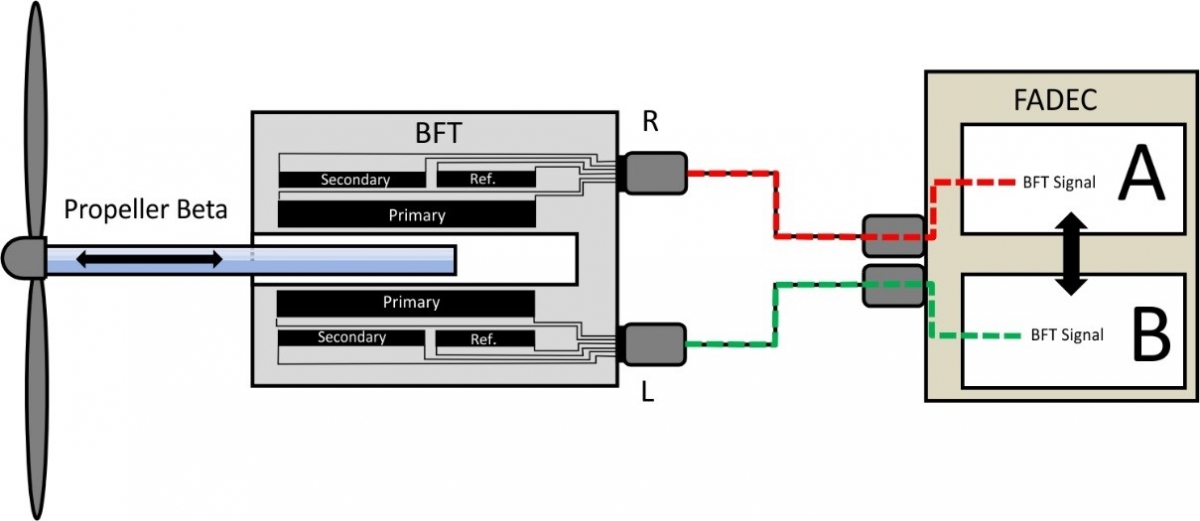 FDR data showed that at the time of the power loss, both A and B FADEC channels (see the illustration below) had recorded a fault on the Beta Feedback Transducer (BFT) mounted on the right engine which had resulted in the FADEC being unable to detect the right propeller blade angle.