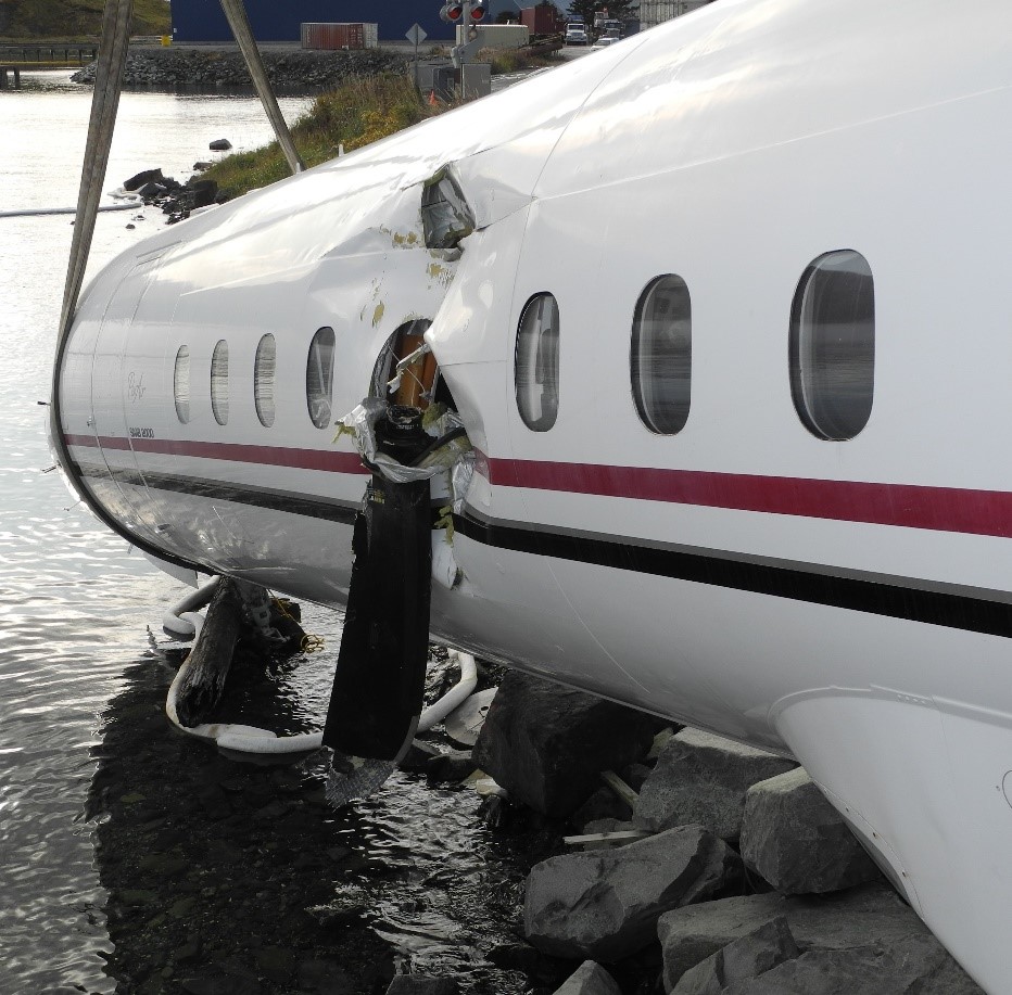 Damage to the aircraft fuselage included a hole and impact damage to the left forward fuselage just forward of the propeller plane in the vicinity of seat 4A where virtually the complete length of one of the two detached left side propeller blades which had hit the fuselage had penetrated it completely and hit the passenger seated in 4A resulting in an immediately fatal injury. Internal damage to the passenger cabin was limited to the left side between rows 3 and 6 where the overhead stowage had become partially detached with associated debris hanging down into the seats or lying on the floor. Overall, the immediate response to the accident was judged by the Investigation to have been “timely and effective”.