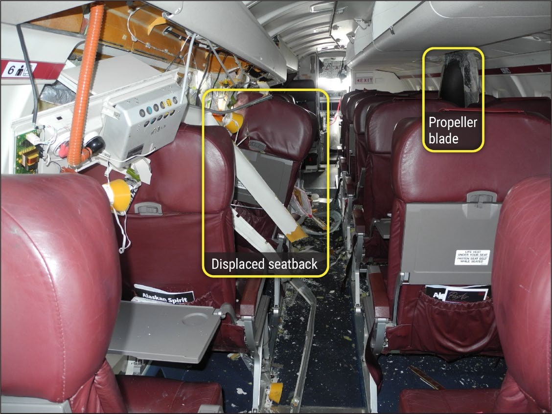 Left side fuselage damage showing where one propeller blade entered the passenger cabin and another became embedded externally. [Reproduced from the Official Report]